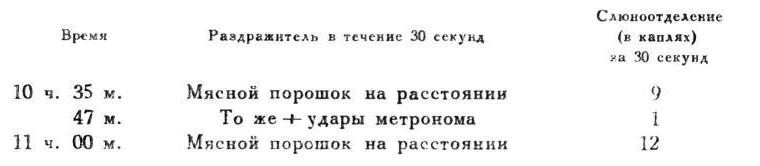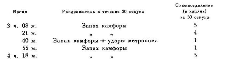 О п ы т 15 III 1911. Другая собака. Удары метронома совпадали с угашенным условным натуральным пищевым рефлексом, а затем применялись вместе с запахом камфоры, искусственным условным пищевым раздражителем.