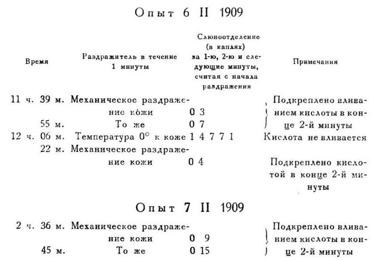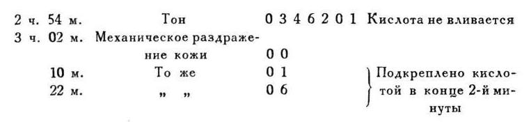 Мы видим, что и агенты, никогда ранее не приходившие в связь с действием кислоты, оказались возбудителями кислотной реакции. Мы замечаем вместе с тем, что впервые испробованные агенты действуют, так сказать, по той же программе, как и выработанный следовой раздражитель, т. е. действу: от не во время их применения, а лишь главным или исключительным образом по прекращении их. Это, конечно, с самого начала склоняет к заключению, что здесь дело идет об обобщенных рефлексах, воспроизводящихся по типу выработанного следового рефлекса. Но этого, разумеется, мало, и, ввиду особенности факта, мы подвергли его многократному переисследованию. Принимая во внимание все нам известное относительно условных рефлексов, мы сделали еще два возможных предположения о ближайшем механизме разбираемого факта.