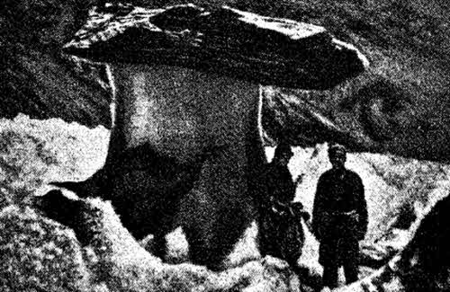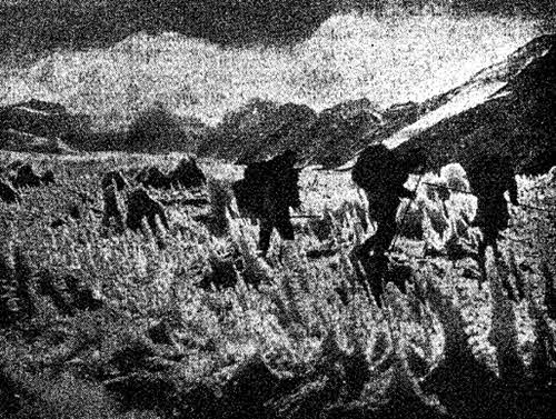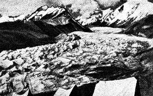Язык ледника движется со скоростью 2025 м в год. Однако скорость движения не постоянна: бывает, повидимому, что движение вперед совсем прекращается, и конец ледника быстро тает, не заменяясь новыми массами льда. Тогда стена льда должна отступать назад. Таким образом, язык, ледника то наступает вперед, то снова отступает, колеблясь около определенной средней границы. За последние 60 лет было два периода таких колебаний.