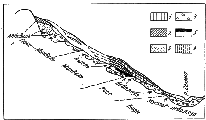 Гюпц-миндельскому межледниковью соответствует аллювиальный комплекс самой верхней террасы Соммы в районе Монтьер-Грасс{46} (рис. 11). В галечниках, венчающих аллювиальный комплекс террасы, которые, по мнению французских геологов, соответствуют похолоданию А, были обнаружены остроконечник и несколько отщепов.
