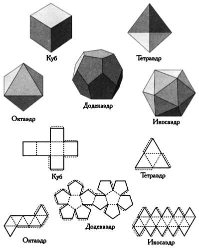 ПРАВИЛЬНЫЕ МНОГОГРАННИКИСуществует только пять правильных выпуклых многогранников. Возможно, именно поэтому греки уделяли им особое значение, соотнося их с четырьмя стихиями: тетраэдр (огонь), куб (земля), октаэдр (воздух), икосаэдр (вода); а додекаэдр олицетворял Вселенную. Правильные многогранники также известны как пять «Платоновых тел».