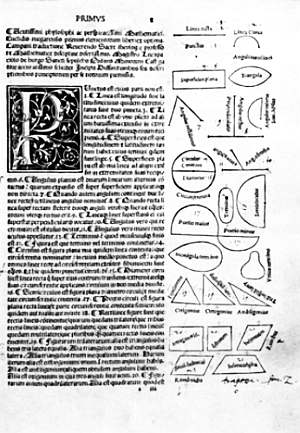 Страница из первой книги «Начал» Евклида. Издание Леонардо де Базилея и Гчльермо де Павия, 1491 г.