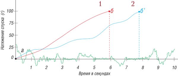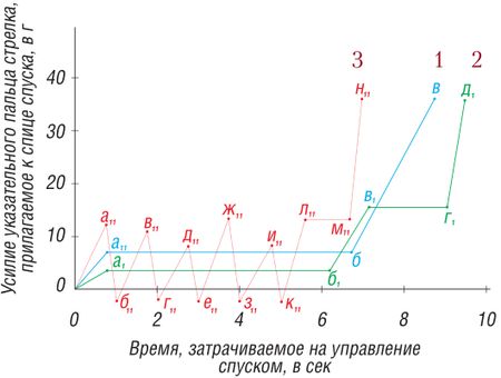 Схема управления спуском при стрельбе из малокалиберной целевой винтовки с ускорителем: 1 последовательно плавный нажим на спицу спуска, 2 ступенчато-плавный нажим на спицу спуска с ускорением, 3 импульсообразный метод управления спуском