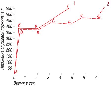 Схема управления спуском с ускорителем при стрельбе из винтовки лёжа, с колена и стоя и из произвольного пистолета: 1 последовательно плавный нажим на спусковой крючок, 2 ступенчато-последовательный нажим на спусковой крючок