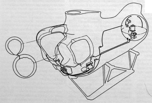 Кормовая сфера прочная уравнительная цистерна, разделенная горизонтальным настилом на две части: нижнюю собственно цистерну и верхнюю, где было размешено оборудование бортовых систем. Две носовые малые сферы служили прочными дифферентными цистернами. Все прочные сферы были связаны между собой несущей стальной трубчатой рамой, в которой было размещено все забортное комплектующее оборудование.