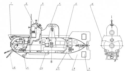 1 забортный прожектор; 2 иллюминатор; 3 входной люк; 4 винт вертикального перемещения; 5 аккумуляторная батарея; 6 балластная цистерна; 7 вертикальный руль; 8 стабилизатор; 9 обтекатель; 10 прочный корпус; 11 лампа-вспышка; 12 манипуляторное устройство