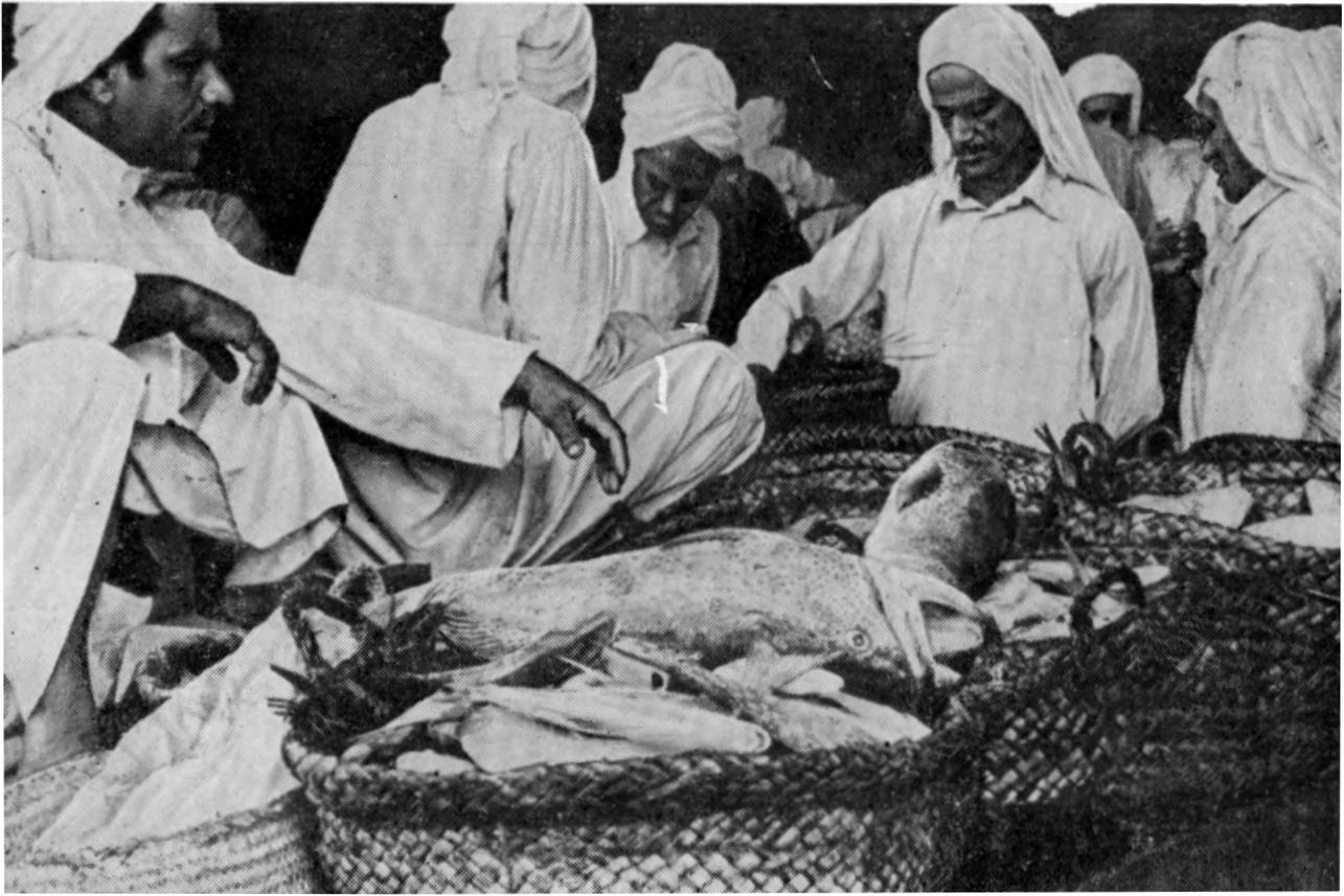 По вечерам, когда ловцы отдыхают после тяжелого трудового дня, саибы ловят на спиннинг рыбу основное питание ныряльщиков. Обедают поздно, при звездах. Здесь же, на палубе, на примитивной жаровне разводят огонь, пекут лепешки, вялят рыбу, варят традиционный кофе без сахара. Во время ловли ныряльщики не имеют права принимать пищу. Это вредно для здоровья. Лишь время от времени им разрешается выкурить сигарету да выпить чашечку крепкого арабского кофе, отдохнуть, согреться и снова в воду.