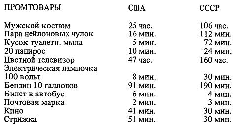 Из данной таблицы следует, что советскому потребителю предоставляется широкая возможность наедаться хлебом и картошкой, все остальное в существенной мере ему менее доступно, чем жителю Соединенных Штатов.