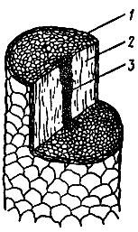В поперечном сечении волос состоит из трех частей (рис. 2): кутикулы, коркового слоя и мякотного вещества, часто называемого мозговым веществом или сердцевиной. Кутикула - внешний слой волоса, состоит из прямоугольных клеток с чешуйчатым строением. Корковый слой состоит из веретенообразных клеток, содержащих пигмент (красящее вещество) и пузырьки воздуха; чем толще корковое вещество, тем эластичней и крепче волосы. Сердцевина - мякотный или мозговой слой волоса, состоит из не полностью ороговевших сплющенных круглых клеток.