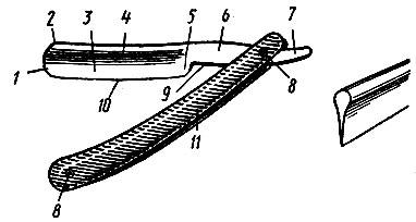 Опасные бритвы (рис. 9) предназначены для стрижки и бритья волос. Они состоят из двух основных частей - ручки 11 и клинка 1, которые соединены между собой заклепкой 8. Ручка 11 опасной бритвы служит одновременно и футляром для предохранения жала клинка 1 от затупления. Она состоит из двух половинок, скрепленных на концах заклепками 8, одной из которых клинок 1 соединен с ручкой 11. Ручки опасных бритв изготовлены из пластических масс или из дерева. .