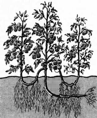Стебель при посадке примерно на 2/3 длины очищается от листьев и на эту же длину прикапывается в землю на небольшую глубину (не более 10 см) в заранее приготовленную борозду, обильно политую водой. Чтобы оставшаяся часть растения (крона) не лежала в сырости, под нее подсыпают сухую землю. Посадку нужно производить, ориентируя растение корнями на юг, а кроной на север. В этом случае рассада, потянувшись к солнцу, в дальнейшем будет расти вертикально. Веревки, на которых будет подвязано растение, теперь уже не будут ему вредить, так как прикопанная часть стебля обеспечит растению дополнительное количество корней. При этом они значительно превосходят основной корень. За счет этого урожайность помидорного растения повышается в 56 раз. В приусадебных хозяйствах, в теплицах для повышения урожайности корневую систему растения можно также увеличить путем приколки одного-двух его боковых побегов (пасынков). В этом случае дают пасынкам отрасти подлиннее, а затем их пригибают к земле и прикалывают, как это показано на рисунке (рис. 11).