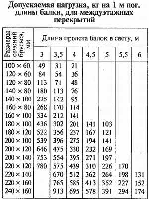 Несущими элементами деревянных перекрытий являются балки, изготавливаемые преимущественно из древесины хвойных пород. Расстояния между балками и размеры их сечения определяют расчетом. Выбрав шаг установки балок перекрытия и определив нагрузку, давящую на нее, можно подобрать размеры сечений балок по таблице.