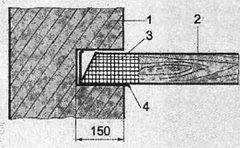 1 кирпичная стена; 2 деревянная балка; 3 конец балки, обработанный антисептической пастой или обернутый рубероидом; 4 гидроизоляция из 2-х слоев рубероида