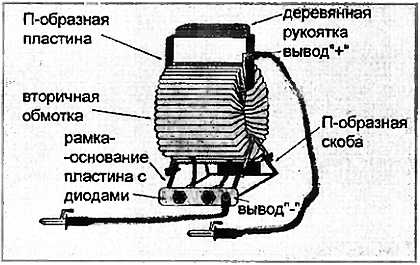 Сердечник трансформатора к рамке-основанию крепят двумя П-образными скобами. С помощью изолирующих шайб необходимо избежать появления короткозамкнутого витка, образованного скобой с рамкой.