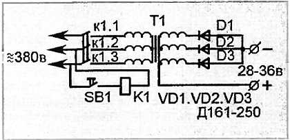 Здесь применен трехфазный однополупериодный выпрямитель, позволяющий получить напряжение холостого хода 36 В. Его повышенное значение объясняется применением более длинных кабелей, соединяющих пусковое устройство со стартером (для крупногабаритной техники длина кабелей достигает 4 м). Применение трехфазного трансформатора дает более широкие возможности для получения требуемого напряжения пускового устройства. Его значение можно изменять, включая обмотки «звездой», «треугольником», применять однополупериодное или двухполупериодное (схема Ларионова) выпрямление.