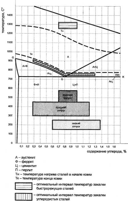А аустенит; Ф феррит; Ц цементит; П перлит; Тн температура нагрева сталей в начале копки; Тк температура конца ковки