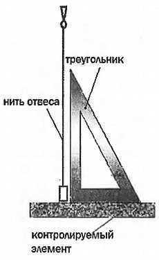 Известно, что нить отвеса занимает строго вертикальное положение. Установив на проверяемый элемент прямоугольный треугольник или другой предмет с прямым углом, проверяют взаимное положение нити отвеса и направленной вверх стороны прямоугольного треугольника. При горизонтальном положении элемента, горизонтальность которого проверяется, направленная вверх его сторона будет параллельна нити отвеса, что легко определить визуально.