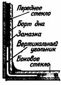 Размеры стекол для дна и стенок рассчитывают после изготовления каркаса, так как они зависят от толщины материала каркаса и стекла и точности изготовлении каркаса. При этом следует учитывать толщину слоя замазки (23 мм) между торцами стекол и каркасом (рис. 2).