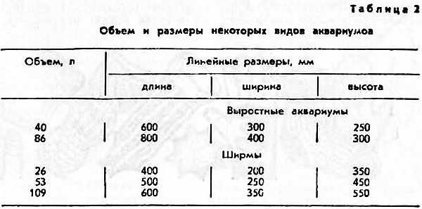 Ширмы аквариумы высотой, равной длине или несколько меньше, хороши для содержания рыб с высоким корпусом и длинными плавниками, а также для коллекций высоких растений. В таблице 2 приведены размеры выростных аквариумов и ширм.