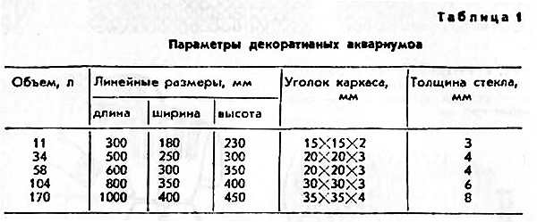 Декоративные аквариумы бывают разных размеров и объемов, высотой до 2/3 длины и шириной до 1/2 длины. Предназначаются для украшения интерьеров помещений и наблюдений за жизнью их обитателей и растений. В этих аквариумах содержат стайки одного или нескольких видов рыб, коллекцию растений (голландский аквариум), а также водных животных. Декоративные аквариумы встраиваются в мебель или обрамляются деревом, пластиком и даже кирпичами. Параметры типичных декоративных аквариумов приведены в таблице 1.
