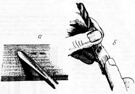а направление движения руки при заточке со стороны фаски; б использование гладкой части сверла и полоски наждачной бумаги для правки стамески со стороны желобка (лица]