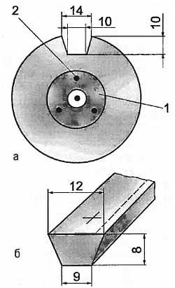 а вид барабана с торца; б зажимной клин; 1 крышка подшипника; 2 шурупы