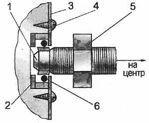 1 вал центра; 2 упорная шайба; 3 крышка подшипника; 4 шурупы; 5 гайка; 6 подшипник
