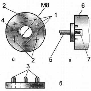 1 центры отверстий под штифты; 2 центры отверстий под шурупы; 3 установленные в шайбу штифты; 4 центральное отверстие М8; 5 шпиндель; 6 барабан; 7 посадочное отверстие