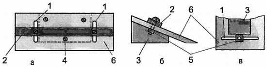 а вид сверху; б вид сбоку; в вид снизу; 1 отверстия направляющей; 2 направляющая; 3 брусок; 4 шурупы крепления фанеры к бруску; 5 прямоугольная гайка; 6 накладка
