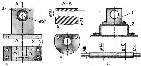 Основная трудность в изготовлении подшипникового узла опоры (5). Этот вариант сначала мной рассчитывался, затем были поиски материала и специалиста-токаря, так как изготовить гнезда для подшипников в опоре технологически не мог. Получалось так: то одного не было, то другого, и в конце концов надоело. Пришлось пойти другим путем. Перелопатить весь доступный «металлолом» с надеждой найти что-нибудь подходящее. Поиски оказались удачными. В останках телетайпов 6070-х годов выпуска обнаружил залежи нужных железок. Нашел не только опоры с гнездами, но и вал с подшипниками. К сожалению, это было в то время, когда цветные металлы еще можно было встретить в российской природе. На всякий случай упомяну и об этом варианте. Если подобранные опоры оказались по высоте меньше 60 мм, то их можно поднять благодаря набору пластин или П-образной пластине-площадке (рис. 21,г). Вместо опоры с двумя подшипниками подойдут две с одним подшипником в каждой.