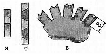 Рис. 29. Элемент зубов фрезы с прямой заточкой (а); элемент зубов фрезы в «разноточку» (б); пропилы для опилок в фрезе (в)