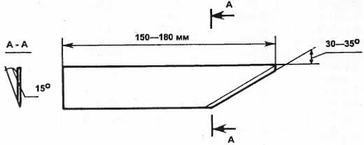 Далее следует снять фаску в 1015° вдоль скошенной стороны лезвия. Фаску надо снимать с наружной поверхности лезвия (для правши и для левши эти поверхности различны; на рис. 2 показана заточка жала для правши).