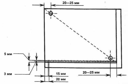 к другу, просверлите два сквозных отверстия диаметром 3 или 4 мм (в зависимости от того, какие винты вы приготовили), оси которых лежат на диагонали меньшего фанерного листа, выходящей из дальнего левого угла, и отстоят от углов на 2025 мм (рис. 3).