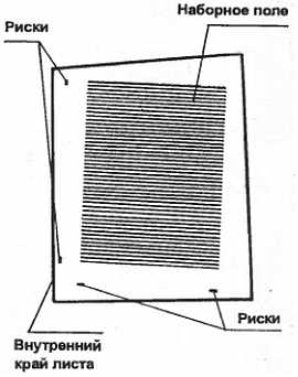 Итак, вы имеете книгу, разобранную на отдельные листы, или, наоборот отдельные листы, которые вы хотите сшить в целую книгу. Переберите эти листы и заметьте те, у которых поля отличаются от остальных в меньшую сторону. Возьмите этот лист и нанесите риски на полях так, чтобы линия, соединяющая их, была параллельна границе наборного поля. Запомните, что вы взяли ориентир и какое расстояние между этим ориентиром и вашими рисками. Если на каком-то листе вы не обнаружите привычного вам ориентира, не впадайте в панику, а просто сравните предыдущий, уже размеченный лист и этот, который поставил вас в тупик. Всегда можно найти что-то общее, что вы возьмете за точку отсчета. На рис. 6 показано, как размечать лист с неровными полями.