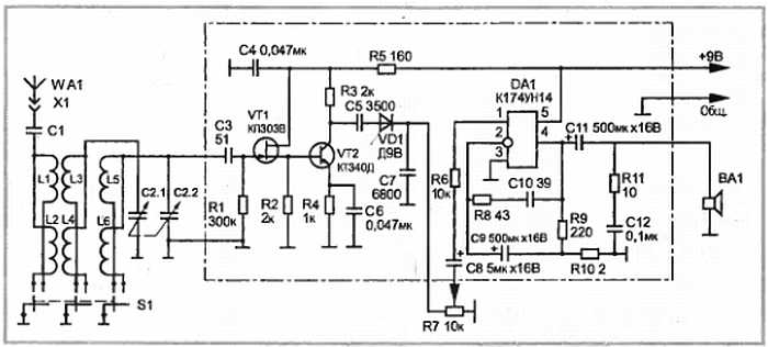 каскадами на транзисторах VT1, VT2. Первый из них выполнен на полевом транзисторе и имеет весьма высокое входное сопротивление, благодаря чему штатные контуры L1L6, С2.1, С2.2 присоединяются через переключатель диапазонов SA1 без введения катушек связи. После детектора, в котором работает диод VD1, выделенный сигнал 3Ч поступает на усилитель, построенный на основе интегральной микросхемы DA1. К выходу последней присоединены динамические головки старого приемника, которые на схеме представлены единственной головкой ВА1. Связь контуров РЧ с внешней антенной WA1 через штатное гнездо X1 и антенный конденсатор С1. Вопрос о питании приемника решается в зависимости от состояния силового трансформатора.