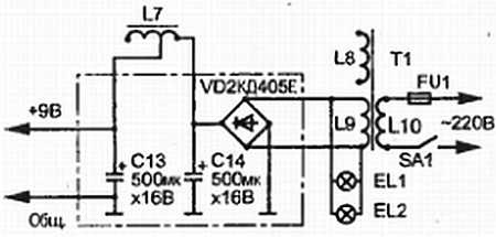 Если таковой неисправен, питать приемник можно либо от гальванической батареи с напряжением 9 В (например, шесть элементов L014), либо от помещенного в футляр радиоаппарата сетевого адаптера с тем же выходным напряжением при токе нагрузки до 0,5 А. Скорее всего трансформатор исправен, и на выводах 2, 7 лампы-индикатора настройки 6Е5С мы обнаружим напряжение 6,3 В. Другим признаком этого служит нормальное свечение лампочек EL1, EL2 подсветки шкалы настройки. Перед тем как вводить щупы «тестера», включенного вольтметром, в «подвал» шасси, следует отсоединить провода от повышающей обмотки L8, где напряжение может достигать 250300 В. Для питания от 6-вольтовой накальной обмотки L9 изготовим простой выпрямитель, чья схема показана на рис. 2.
