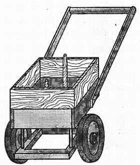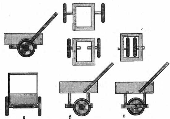 И наконец при очень узкой колее (тропинке, доске и т. п.), особенно при подвозе стройматериалов, вывозе мусора и других подобных работах, требуется одноколесная (одноопорная) тачка. В этом случае колеса с полуосями устанавливают изнутри рамы (рис. 3, в), причем в передние втулки, что смещает центр тяжести с колеса на руки работающего, как в обычной тачке. Это больше нагружает человека, но повышает управляемость на узкой колее.