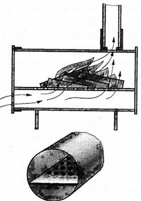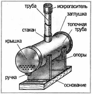 В качестве опор используют пластины тонколистового металла с вырезами по форме печи и прибитыми снизу «лапками» к деревянному основанию из толстой (4050 мм) доски. В качестве колосника удалось подобрать металлическую полосу с отверстиями. Ширина ее должна быть чуть меньше диаметра топочной трубы. Тогда при укладке полосы в топочную трубу она делит ее сечение в соотношении примерно 3/1, где большая верхняя часть является топочной, а нижняя (меньшая) поддувалом (см. рис. 22).