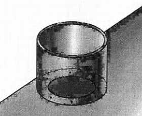 Главным узлом всей конструкции (по сути непосредственно печкой) является топочная труба. Это кусок тонкостенной трубы диаметром около 25 см (от какого-то вентиляционного контура), который имел на одном конце небольшой бортик. Благодаря этому бортику удалось заглушить одно отверстие трубы, приклепав к нему вырезанный по размеру кусок тонколистового металла. Сверху в трубе вырезано отверстие диаметром на 1,52 см меньшим, чем диаметр используемой дымовой трубы. Переходом от печи и местом установки трубы является металлический стакан с таким же отверстием на дне, который Крепят маленькими винтами к топочной трубе (на рис. 21 показан «прозрачным» для наглядности).