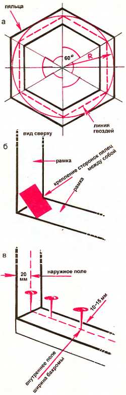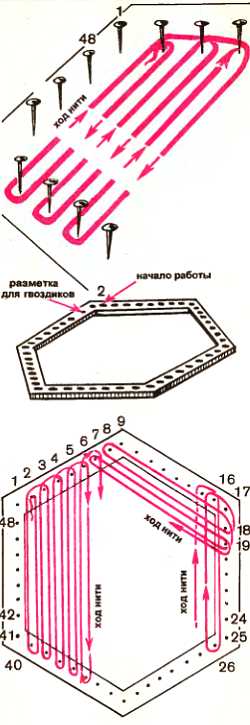 При изготовлении самой рамки можно использовать разные приемы. Например, собрать ее из шести частей, заклеив уголки с нерабочей (без гвоздиков) стороны, как показано на рис. 1,б. Середина рамки должна быть обязательно пустой, иначе будет очень сложно соединять уже натянутые нити (попытка вбить гвоздики шестиугольником на сплошную поверхность и на такой основе сделать салфетку не увенчалась успехом). Очень важно выдержать линию гвоздиков и равные расстояния между ними. Вбивать до конца их не надо, не должны они и выглядывать с обратной (нерабочей) стороны, но держаться должны крепко. Фрагмент готовой рамки показан на рис. 1,в.