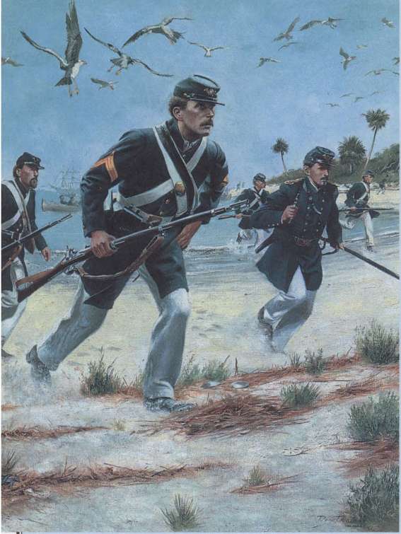 Морские десантные отряды были экипированы как пехота в соответствии с уставом 1859 года. Их повседневная форма одежды состояла из сюртука (такой вид военной формы, сменивший старые мундиры фрачного покроя, был введен во Франции в 40-е годы XIX в. и назывался туникой. В 50-е годы практически все европейские армии перешли на этот столь удобный покрой. Прим. ред.) и белых парусиновых брюк, замечательно подходивших для теплого и влажного климата побережья Каролины. Они носили французские кепи с эмблемой охотничьего рожка, напоминавшие головные уборы федеральной пехоты. В арсенал морских пехотинцев входили наряду с различными видами длинноствольного оружия ружья образца 1855 года (rifled musket. Прим. пер.). Одной из наиболее отличительных особенностей обмундирования морских пехотинцев США времен Гражданской войны были белые ремни из буйволовой кожи и желтые шелковые шевроны унтер-офицеров, которые носились уголком вверх, а не вниз, как у других родов войск. Обмундирование офицеров также отличалось: их шинели были двубортными, а знаками отличия были «русские узлы», а не контрэполеты. («Russian knots». Прим. пер.)