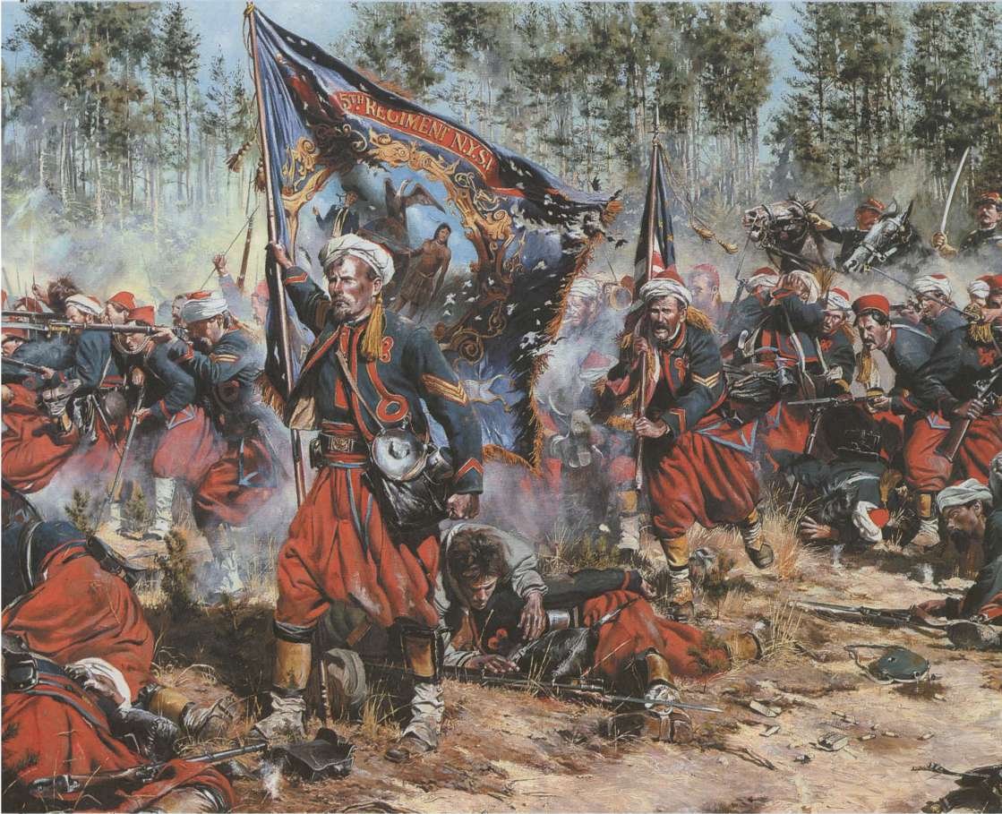 Битва при Гейнс-Милл 27 июняТри месяца спустя после прибытия 5-го Нью- Йоркского волонтерского пехотного полка на Виргинский полуостров когда-то великолепная красно-синяя униформа зуавов, выделявшихся своей живописностью среди всех остальных полков Севера, теперь являлась наглядным свидетельством того, насколько трудными оказались военные будни.