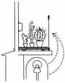 Самый простой способ добиться понижения температуры на подоконнике я уже упоминала: поставить на край подоконника легкую застекленную или затянутую полиэтиленовой пленкой раму, доходящую до краев оконной ниши. Высота рамы 4050 сантиметров. Если батарея центрального отопления помещается под окном, то на всю площадь подоконника необходимо сделать помост из досок или плотной фанеры. Помост должен быть приподнят на рейках двухсантиметрового сечения, иначе тепло, от нагретого батареей подоконника не даст температуре понизиться.