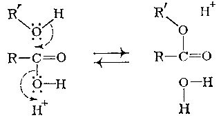 Протон атакует гидроксильную группу кислоты. Разрывается связь гидроксила с углеродом и одновременно завязывается связь с подошедшим протоном, т. е. образуется вода. Молекула спирта атакует положительно заряженный углерод в остатке кислоты. При этом разрывается связь кислорода с водородом и "освободившаяся" пара электронов идет на образование новой связи с углеродом.