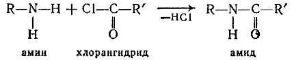 Итак, аланин карбоксильной группой зацепился за смолу, но аминогруппа у него свободна. Теперь к этой аминогруппе надо прикрепить через карбоксильную группу следующую аминокислоту лизин. Как это сделать? Хороший способ получения амидной связи между карбоксилом и аминогруппой ацилирование последней хлорангидридом кислоты. При этом выделяется хлористый водород:
