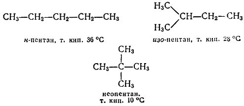 Приставим к полученным молекулам еще по "кирпичику". Начнем с н-бутана. Здесь можно заместить на метил один из крайних атомов водорода. Получим нормальный пентан. Можно заместить один из средних водородов. Придем к изо-пентану. По-видимому, из н-бутана больше ничего нового не получишь. Обратимся к изо-бутану. Если в нем заместить один из крайних водородов (в СН3-группах), то придем к уже упоминавшемуся изо-пентану, а замещая средний единственный атом водорода, получим неопентан: