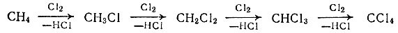 Если в реакцию вводить такие количества реагентов, чтобы на одну молекулу хлора приходилось две молекулы метана, то в основном мы получим хлористый метил СН3Сl. Если же взять хлор в избытке, то реакция замещения пойдет дальше и получится, помимо хлористого метила, еще хлористый метилен СН2Сl2, хлороформ СНСl3 и, наконец, продукт полного замещения водорода на хлор, четыреххлористый углерод ССl4: