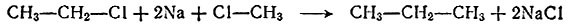 Если теперь в этане заместить один из водородов (любой атом) на метил, то мы получим новое вещество пропан СН3-СН2-СН3. Как это можно сделать практически, мы знаем: сначала в метане и этане заместить один водород на хлор и затем подействовать на смесь метил- и этилхлорида натрием (эта реакция называется реакцией Вюрца в честь французского химика, ее открывшего):