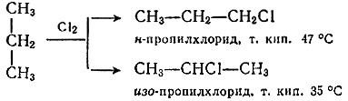 Пойдем дальше. Заместим в пропане один из атомов водорода на хлор. Оказывается, теперь уже не все равно, какой атом замещать! Замещая водород при крайнем атоме углерода (таких атомов два) или же при среднем, мы получим два разных соединения: нормальный пропилхлорид (н-пропилхлорид) и изопропилхлорид: