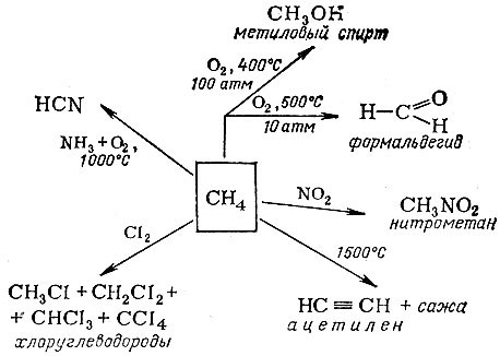 У предельных углеводородов есть другое название парафины, отражающее их химическую инертность (по латыни parum affinis малое сродство). И все же они довольно широко применяются в химической промышленности для получения самых разнообразных веществ. Основные направления промышленного использования метана показаны на схеме.